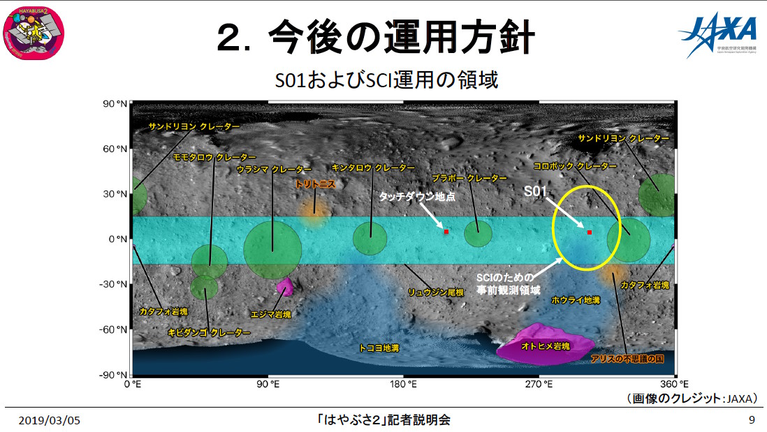 衝突装置を投下する地点は、リュウグウの赤道を取り巻く「リュウジン尾根」の上にある「S01」と呼ばれるエリアの近辺になるという。この実験で人工クレーターを作った後、クレーターの内部や周辺に岩塊の少ない場所があれば、その地点を目指して5月に第2回の着陸を行う予定だ。ただし、着陸に適した場所がクレーターの周囲になければ、まったく別の場所に降りる可能性もあるという。