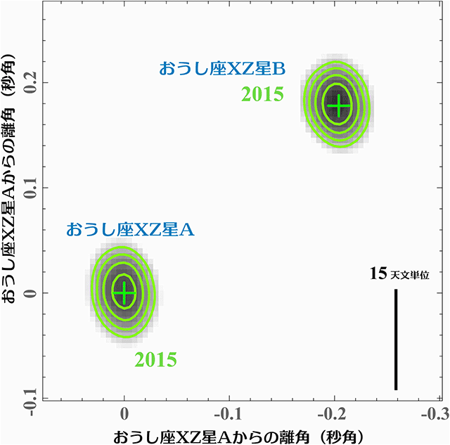おうし座XZ星系の軌道運動。おうし座XZ星A(左下)の位置を固定し、おうし座XZ星B(右上)の位置の変化を表している。等高線は電波の強度分布を表し、それぞれから求められた星の位置を十字印で示している。画像クリックでアニメーション表示(提供:ALMA (ESO/NAOJ/NRAO), T. Ichikawa et al.)