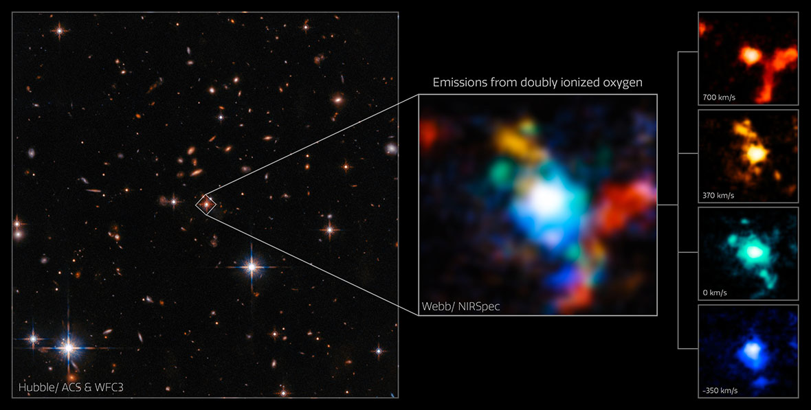 独・ハイデルベルグ大学のDominika Wylezalekさんたちの研究チームはJWSTの近赤外線分光器「NIRSpec」を使用して、SDSS J165202とその周辺を分光観測した。ドップラー効果によって私たちの方へ動いている物質からの光は波長が短く(青く)なり、遠ざかっている物質の光は波長が長く(赤く)なるので、分光観測によってSDSS J165202の母銀河周辺におけるガスの動きを調べることができる。