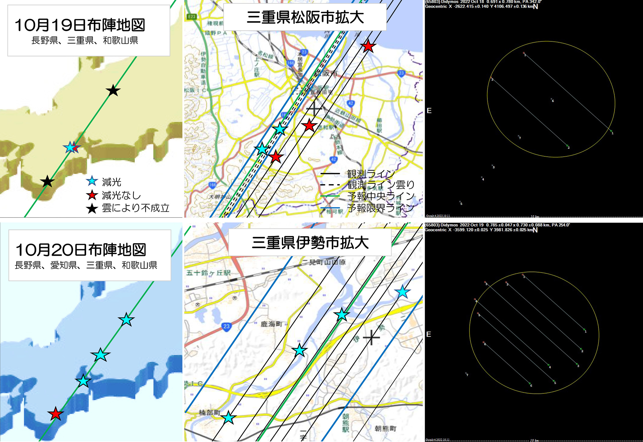 10月18日、19日の掩蔽帯図と観測ポイント(作成:渡部勇人 電子国土地図等で作成)と暫定整約図。ディディモスの断面が浮かび上がりつつある(整約図作成:渡辺裕之)。10月18日、19日の観測に参加した日本チームのメンバー:井田三良(滋賀県東近江市)、山村秀人(滋賀県米原市)、北崎勝彦(東京都武蔵野市)、渡辺裕之(岐阜県垂井町)、真砂礼宏(和歌山県上富田町)、浅井 晃(三重県桑名市)、瀧本麻須美(三重県亀山市)、渡部勇人(三重県いなべ市)、(順不同)。画像クリックで表示拡大