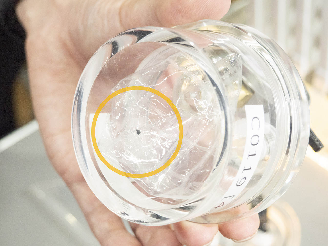 大澤さんたちのチームが提供を受けたリュウグウ粒子の一つ「C0119」(黄色の円内)。質量は4.6mg、大きさは約2.7mm。第2回タッチダウンで採取されたもの。フッ素樹脂フィルムに入れられ、窒素を充填した容器に格納されている。画像クリックで表示拡大(撮影:星ナビ編集部、以下同)
