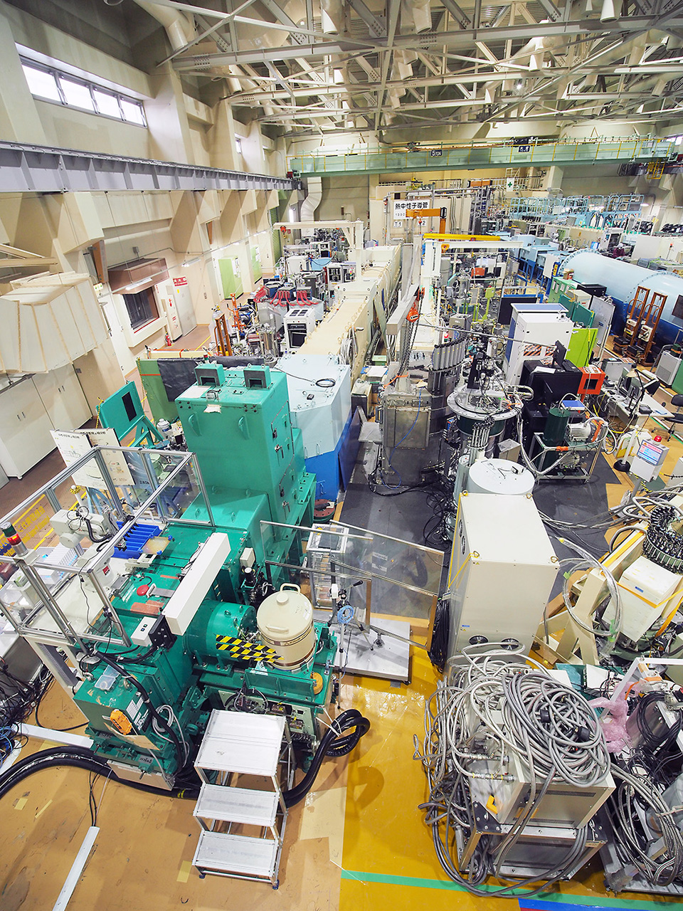 研究用原子炉「JRR-3」の中性子ビームを導くビームホール。正面奥の壁の向こうに炉心があり、そこで生成した15meV(ミリ電子ボルト)の熱中性子が導管を通って実験装置に入射する。緑色の装置が大澤さんたちのチームが使う即発ガンマ線分析装置。JRR-3では様々なエネルギーを持つ9本の中性子ビームを利用できる。画像クリックで表示拡大