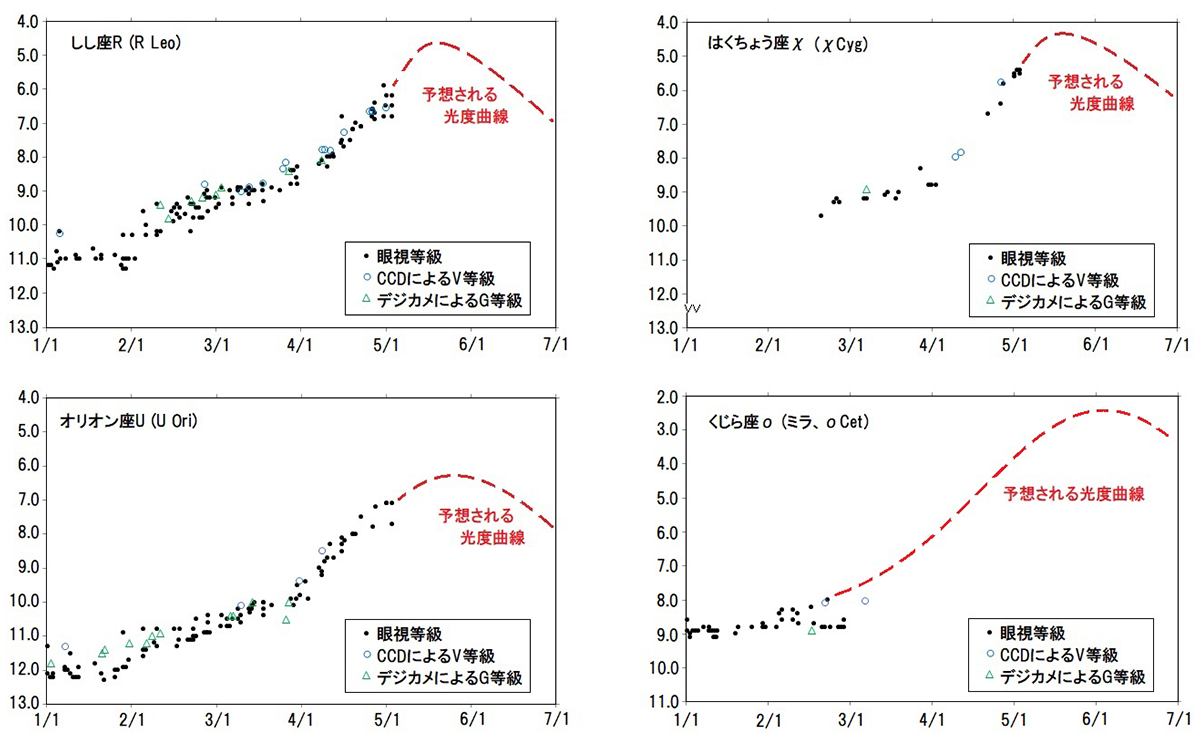 「ミラ型変光星」は光度変化が大きく、わりと明るい星もあることから人気の変光星です。そのなかでも見やすい明るさになる、しし座R(R Leo)・オリオン座U(U Ori)・はくちょう座χ(χ Cyg)・ミラ(ο Cet)が、この5月から6月にかけて相次いで極大を迎えようとしています。