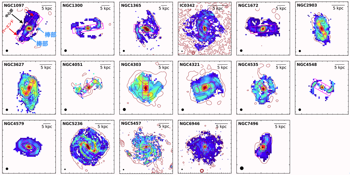 数個の棒渦巻銀河については、分子ガスから新しい星が形成される効率を示す「星形成効率」が棒部で低いことが確認されている。しかし、未調査の銀河も多く、この傾向が棒渦巻銀河全体で一般的なのか、棒部による抑制の度合いは銀河によってどの程度異なるのか、抑制の原因が何であるのかといった重要な問いへの答えはわかっていなかった。