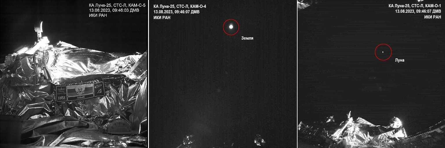 ルナ25号が15日に撮影した自撮り写真。(左)ミッション・エンブレムと搭載されたマニピュレーターのバケット、(中)探査機の背景に写る地球、(右)探査機と月。画像クリックで表示拡大(提供:ROSCOSMOS)