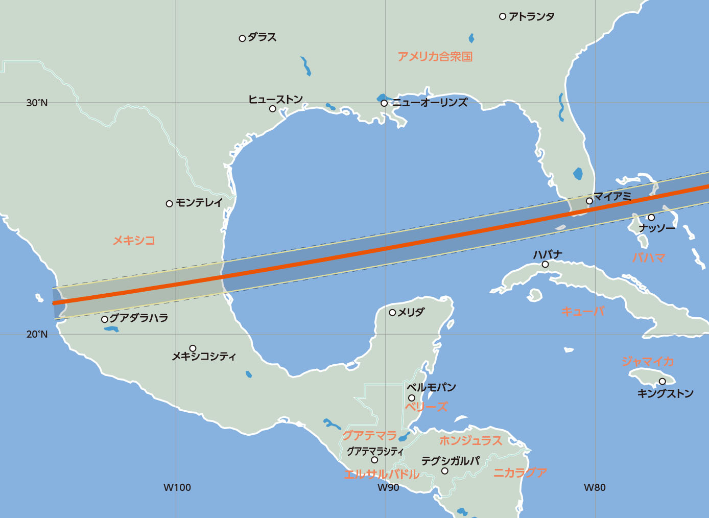 ベテルギウス食が見られる地域。現象前に発表された予報図。赤い線が恒星食中心線、黄色の線が南北限界線。点線は誤差±2.6km(1σ)。それぞれ画像クリックで表示拡大(出典:星ナビ2023年12月号)