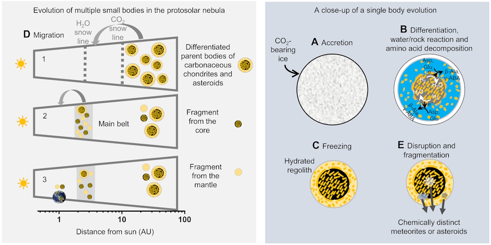 リュウグウのような小惑星とCI、CM、CR炭素質コンドライトの形成と進化のシナリオ。(左)ステージD:移動(1)原始太陽系星雲内の二酸化炭素スノーライン(CO2 snow line)の外側で炭素質コンドライトや小惑星の母天体(外側が黄色、内側が茶色の丸)が形成されたあと、水岩石分化し小惑星帯(Main belt)へ移動、(2)形成時から続く天体同士の衝突により、さらにコアの破片(茶色の丸)もできて地球近傍へ移動、(3)現在の状態。マントルの破片(クリームイエローの丸)。コアとマントル領域の化学的な違いにより、化学的に異なる隕石や小惑星が形成される。(右)単一天体の進化のクローズアップ。ステージA:二酸化炭素を含む氷が降着。ステージB:分化、水と岩石が反応しアミノ酸の分解が起こる。ステージC:含水レゴリスに覆われた天体が凍結。ステージE:炭素質小惑星と炭素質コンドライトを形成する破壊と断片化が起こる。画像クリックで拡大表示