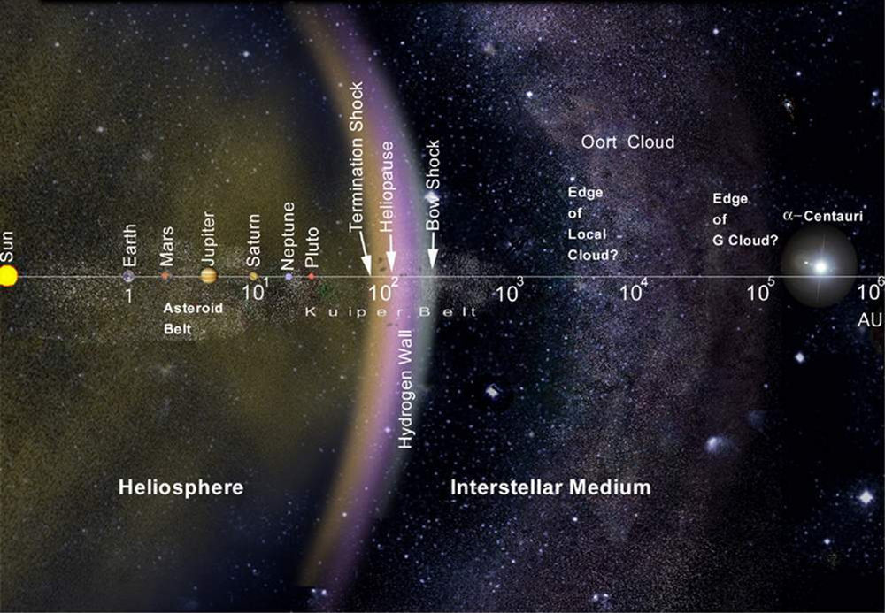 太陽圏や太陽圏終端衝撃波の範囲などを表すイラスト。太陽から100天文単位(約150億km)前後に、太陽圏終端衝撃波(Termination Shock)、太陽風が星間物質や銀河の磁場と衝突して完全に混ざり合う境界面で「太陽圏の果て」に当たるヘリオポーズ(Heliopause、太陽圏界面)、バウショック(Bow Shock、弧状衝撃波面)が存在し、この付近で宇宙線異常成分が生成されると考えられている。画像クリックで拡大表示(提供:NASA)