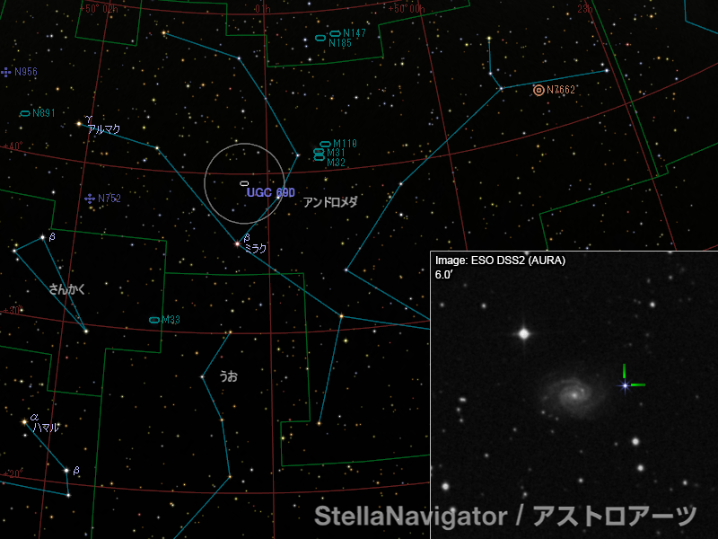UGC 690周辺の星図と、DSS画像に表示した超新星。画像クリックで星図拡大(「ステラナビゲータ」で星図作成。DSS画像の版権について)