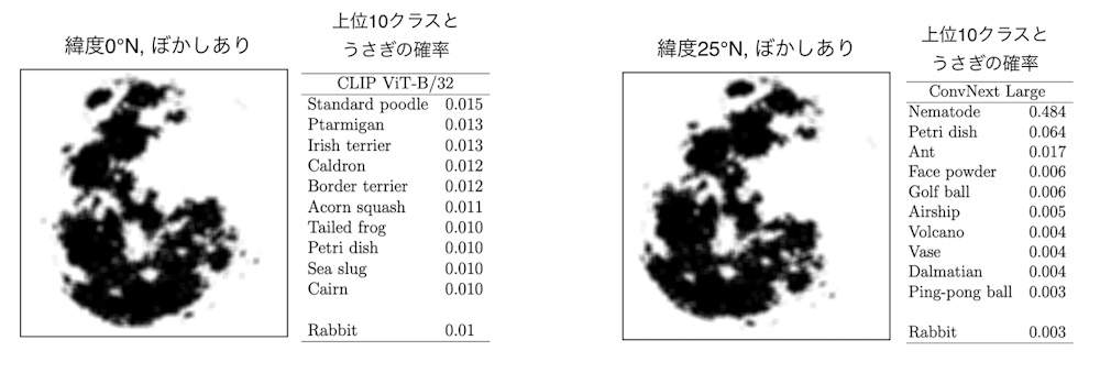 月の見え方(角度)は、時刻や季節、観察場所の緯度によって変化する。そこで庄司さんは、異なる緯度で観察した月の模様の向きが「うさぎ」と「顔」のどちらに見えるかについて、OpenAIが開発したAIモデル「CLIP」に判断させ、月の模様の見え方と緯度との関係について考察した。