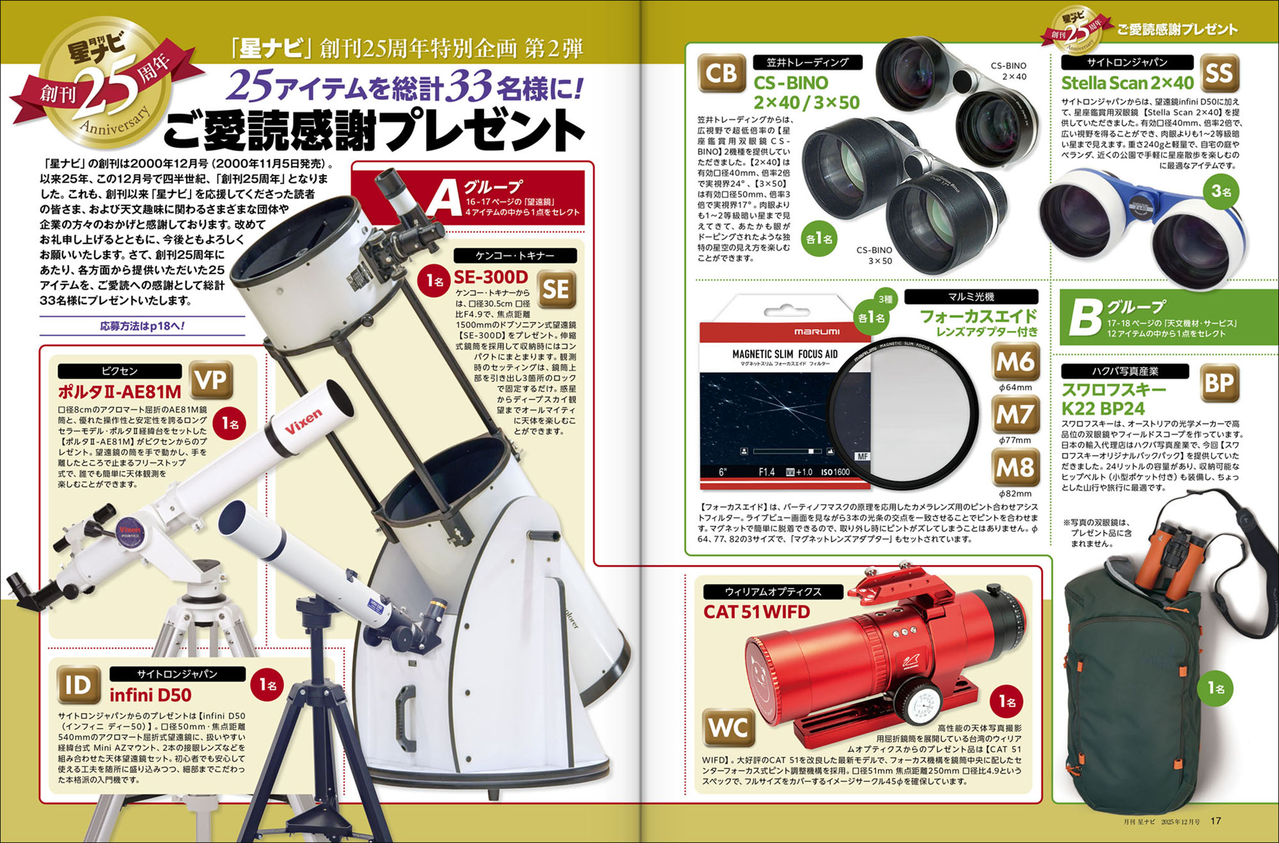 「星ナビ」は、2000年12月号の創刊から、この12月号で25周年。皆様への感謝を込めて、望遠鏡や天文グッズ、リモート望遠鏡利用券など25アイテムを総計33名様にプレゼント。奮ってご応募ください。