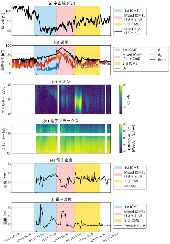 ベピコロンボが観測したICMEのデータ。(a)が宇宙線の量を表す。青色の時間帯に、太陽からのICMEが通過したことで宇宙線が一時的に減る「フォーブッシュ減少(FD)」がみられた。(b)~(f)は宇宙線以外のデータ。画像クリックで表示拡大