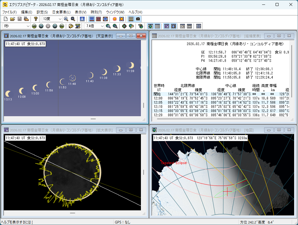 コンコルディア基地(南極)でのシミュレーション。日食帯地図や時刻表、天空表示、連続表示など、多角的に日食現象をシミュレーションできる。画像クリックで表示拡大