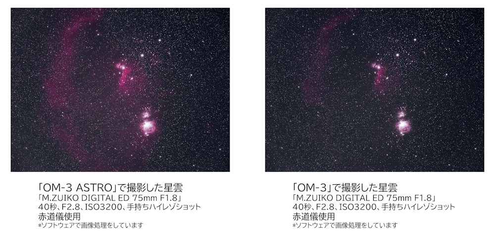 星雲の撮影の比較。(左)「OM-3 ASTRO」で撮影、(右)「OM-3」で撮影。画像クリックで表示拡大