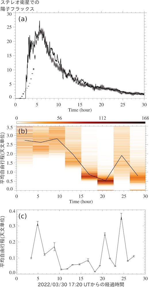 また、このシミュレーションを使って粒子の「平均自由行程」(粒子が散乱されずに直進できる平均距離)という量の時間変化を推定したところ、現象が進むとともに平均自由行程が短くなることが明らかになった。これは、ベピコロンボを通過した粒子が次第に周囲の影響を受けながらステレオに到達したことを示唆している。