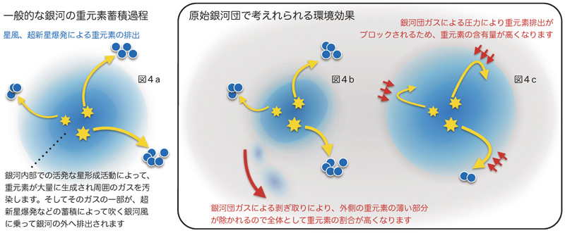また分光観測から、同じ重さの銀河でも、密度の高い原始銀河団に含まれるものは銀河がまばらな領域にあるものと比べてガスの重元素の割合が高いこともわかった。重元素とは水素やヘリウムなど以外の重い元素のことで、恒星内部で作り出され、星風や超新星爆発といった星の終末プロセスによって周囲に流れ出す。