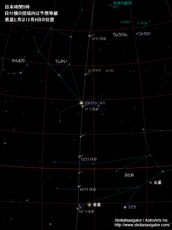 赤道座標の星図。新月は12月11日と1月10日。彗星の明るさや尾は、わかりやすいように大げさに表現している。クリックで拡大