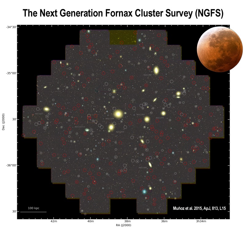 セロ・トロロ・汎アメリカ天文台(CTIO:Cerro Tololo Inter-American Observatory)の4mブランコ望遠鏡で「次世代ろ座銀河団サーベイ(NGFS)」と名付けられた観測を行っている研究グループが、このろ座銀河団に多数の矮小銀河を発見した。