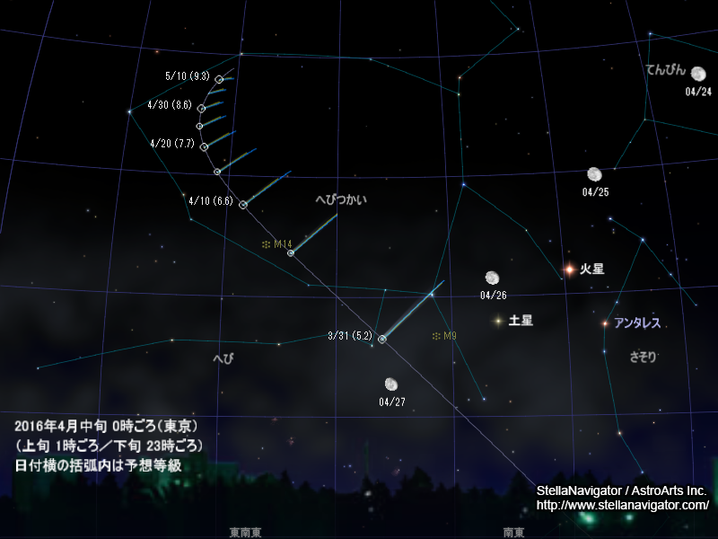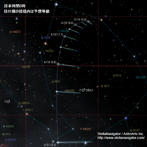 朝4時ごろの見え方。彗星は模式的に表現している。3月27日に散開星団M6、30日に球状星団M9と接近し、4月6日ごろにM14と大接近する。クリックで拡大