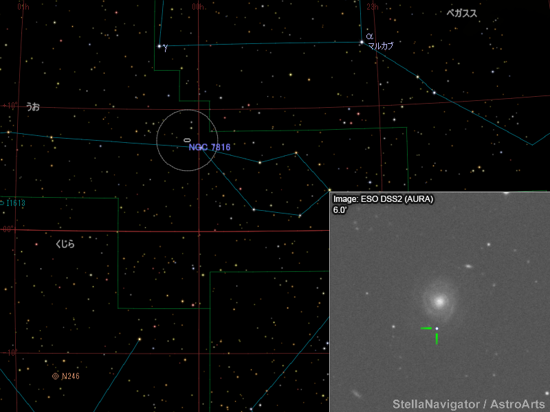 NGC 7816周辺の星図と、DSS画像に表示した超新星。クリックで星図拡大(「ステラナビゲータ」で星図作成。DSS画像の版権について)