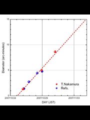 (2枚目)自分で撮影した画像を主として、視直径の変化を図示してみました。ほぼ直線的にコマが大きくなってきています。明るさは落ちていくのかもしれませんが、このまま行けば..来月中旬には月と同じ視直径に達してしまうことになります。また、来月以降も大きくふくれあがった宇宙の提灯を撮影するのが楽しみです。