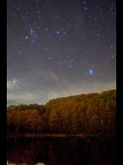 (1枚目)カラマツ紅葉で有名な御鹿射池に昇るスバルが映り、蓼科山の上に淡緑に輝くホームズ彗星が見えました。