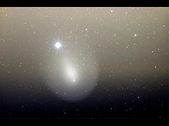 (3枚目)薄雲のためぼやけてしまいましたが、アルゲニブがすっぽりと彗星に覆われているのが分かります。