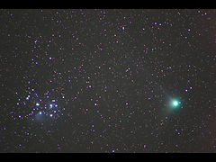 暗い空でスバルとの接近を見ることができてよかったです。明るさは約3等級。ひじょうに淡いながら約10度程度の尾が確認できました。肉眼ではっきりと彗星の存在が確認できました。