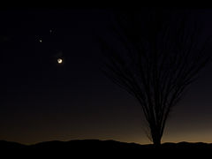 (1枚目)金星と木星のそばに、ようやく月が来てくれました。公園の樹木越しにまず1枚。