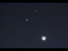 コンデジ購入2日後に撮影したもので、手持ち撮影です。手ブレ補正がよく効くため、もう少し遅いシャッターでも手持ちでいけます。細い月の上に金星と木星、2つの明るい惑星がきれいに見えていました。