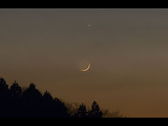 (3枚目)贅沢な風景だったので撮影を続けました。月齢2日の地球照と金星です。太陽からの離角(観測者からみて距離は無視して)の差で満ち欠けの度合いが変わっていくのが面白いと思いました。金星は「上弦の金星」でしょうか。