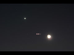 美しく並んだ金星と月に加え、その間にある海王星もあわせて写真におさめてみました。明暗の差があるため、ゴーストを画面の外に追い出すのに苦労します。