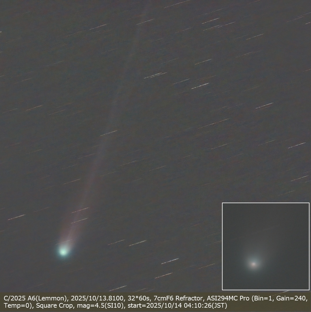 C/2025 A6(Lemmon), 2025/10/13.8100, 32*60s, 7cmF6 Refractor, ASI294MC Pro (Bin=1, Gain=240, Temp=0), Square Crop, mag=4.5(SI10)