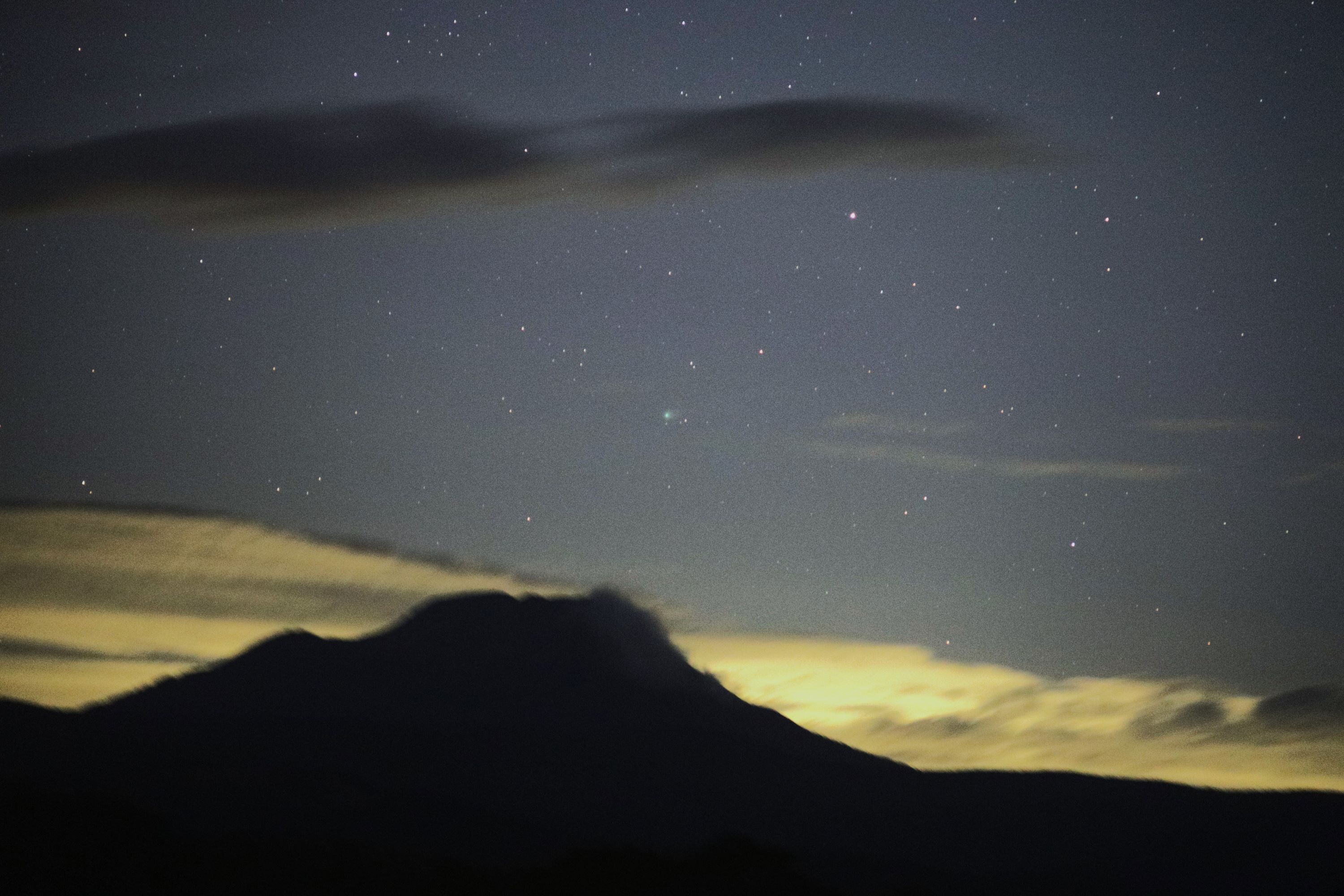 10月10日夕方のC2025 A6(Lemmon)です。 緯度の高い北海道では、レモン彗星が夕方の空に見え始めました。 この時の地平高度は4度です。 空の半分くらいが雲に覆われる天候でしたが、幸いにも北の空に晴れ間があり撮影することができました。 一緒に写っている山は、阿寒・摩周国立公園の秀峰、雄阿寒岳です。