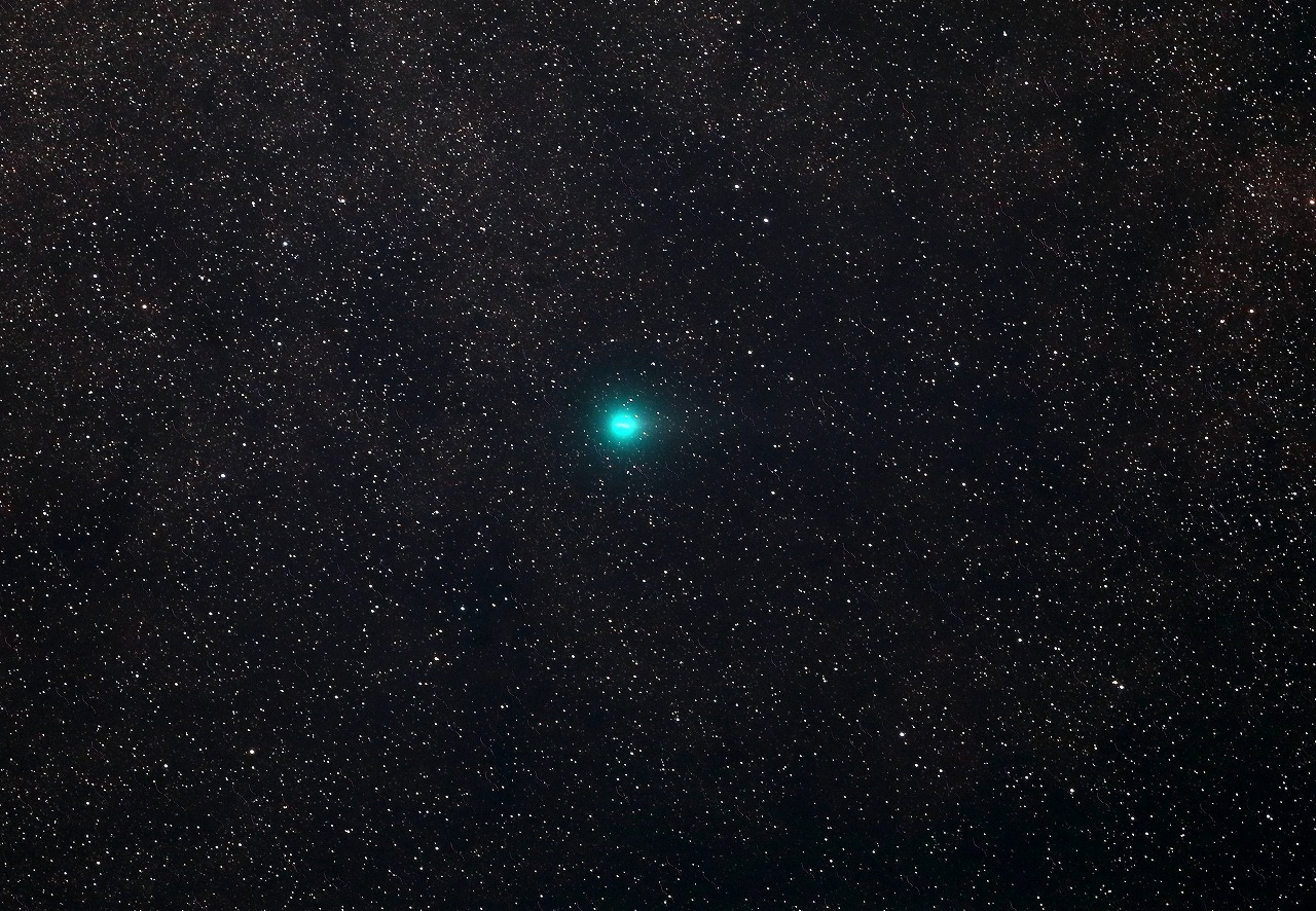山陰での貴重な晴れ間を利用してスワン彗星を撮影しました。南の空の天の川にかかるところに位置しています。さすがに暗い星が多ところにいます。双眼鏡でも十分確認できました。短いテイル(尾)がかすかに写っているようです。