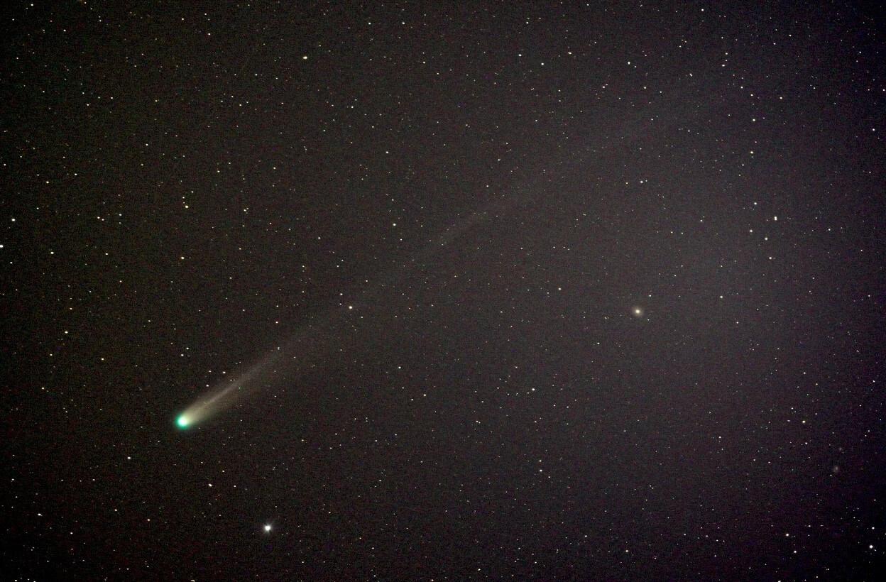 風が強く機材が揺れて長時間の露光は無理なので3.2秒×60枚 192秒 3.2分の露光。 SI10で通常加算コンポジット、詳細編集モードで調整。SILKYPIXで40%縮小トリミング。 絞り開放f=1.8で撮影したので周辺減光がひどかった。 彗星の周辺の星の写りが悪いのか、ステラナビゲーターを最新のデータに更新していても、 メトカーフ・コンポジットでは 「画像マッチングに失敗しました」とのコメントが出て、コンポジットができない時がかなりあった。