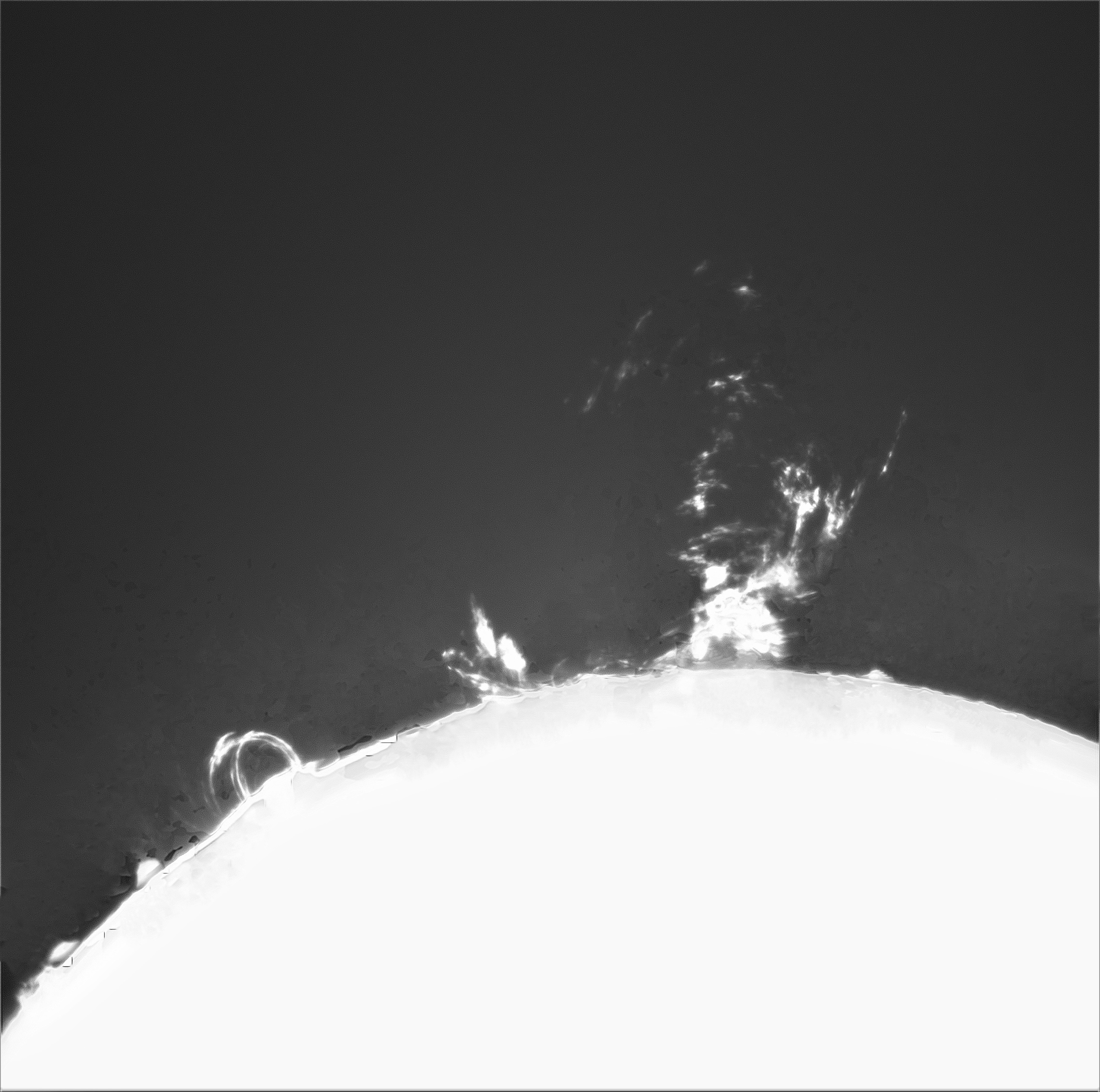 14:27(JST)最大 M1.0のフレアが、4246の下の4248でありました。プロミネンス噴出を伴っていて、 4246で形成され続けているループプロミネンスと同時に観察できました。 (ただ、如何せん北風に乗って雲が流れ込んでいる状況で、背景や光球面はムラだらけになりました。 90度左回転させています。)