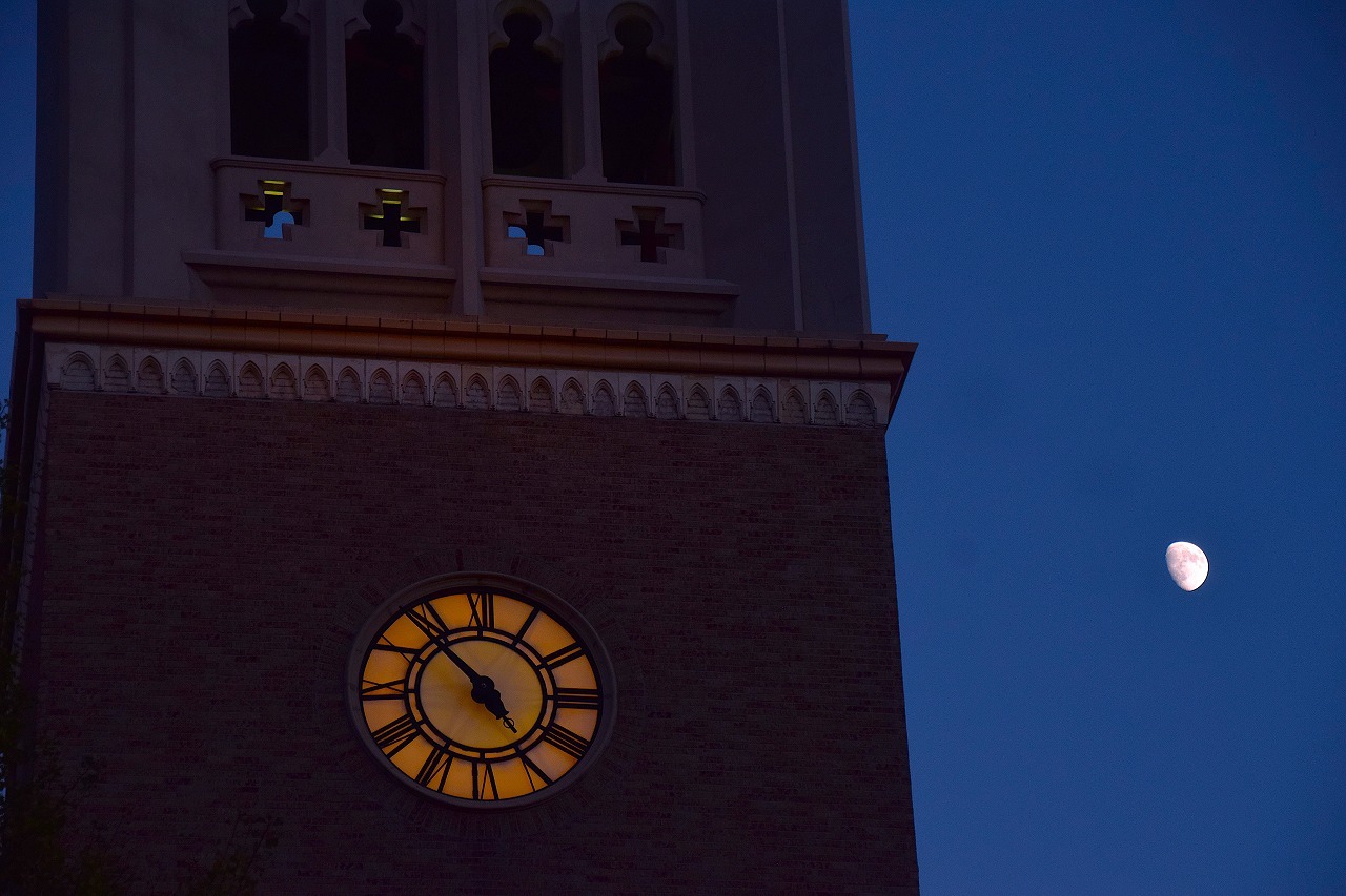 早稲田大学大隈講堂の時計台と十三夜1日前の月を撮影しました。