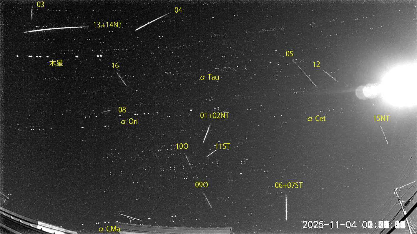 00:17から約2時間の16コマを処理しました。夜半後も快晴が続きました。 出現した順に数字と記号を始点付近に記入。tは痕traceあり。O:オリオン座流星群、ST:おうし座南流星群、NT:おうし座北流星群