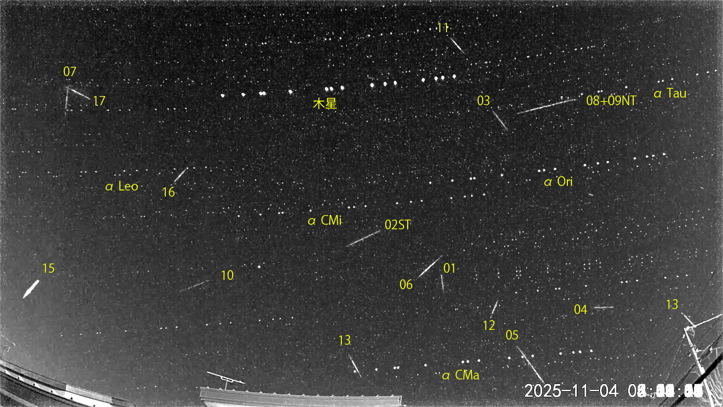 02:50から約2時間の17コマを処理しました。 出現した順に数字と記号を始点付近に記入。tは痕traceあり。O:オリオン座流星群、ST:おうし座南流星群、NT:おうし座北流星群