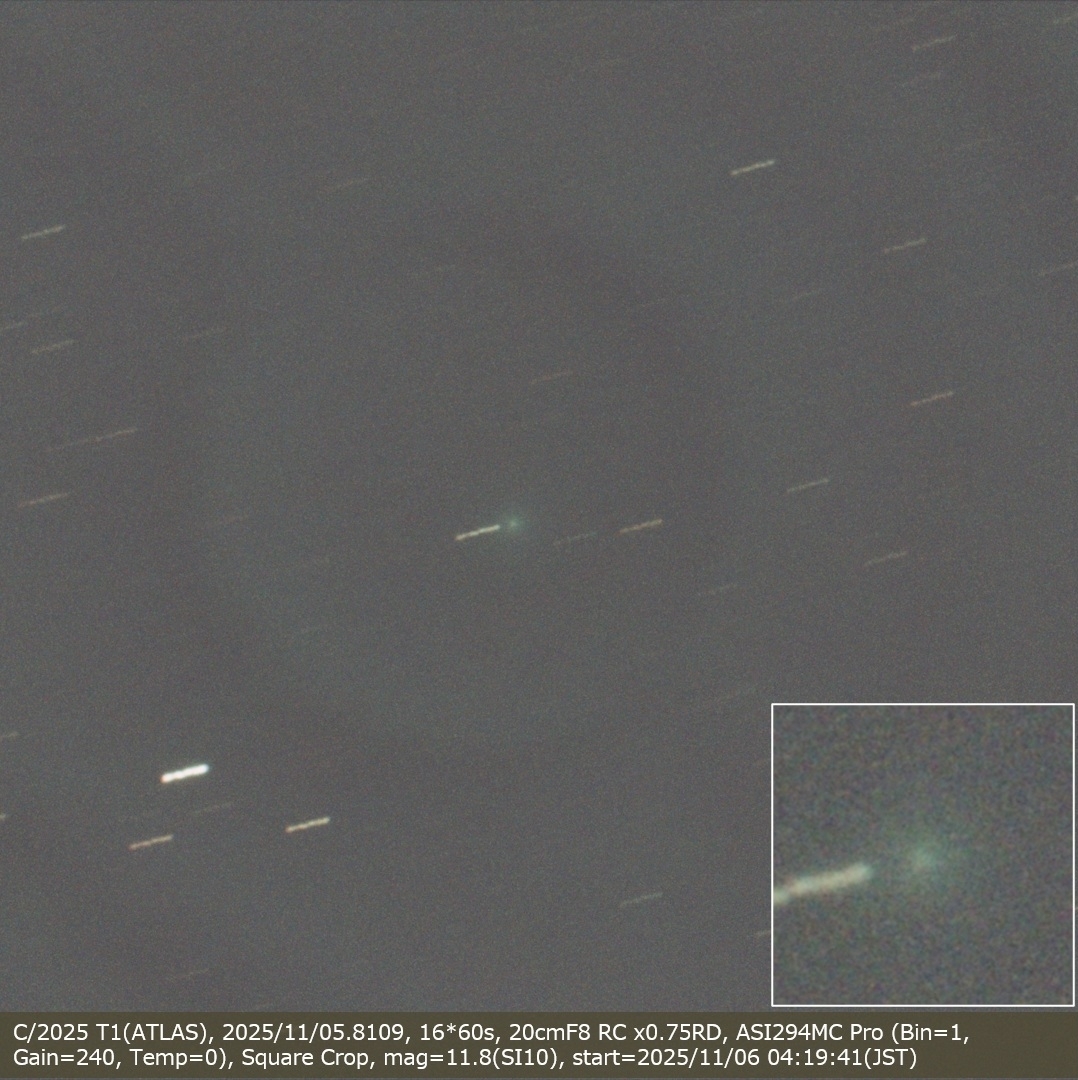 C/2025 T1(ATLAS), 2025/11/05.8109, 16*60s, 20cmF8 RC x0.75RD, ASI294MC Pro (Bin=1, Gain=240, Temp=0), Square Crop, mag=11.8(SI10)
