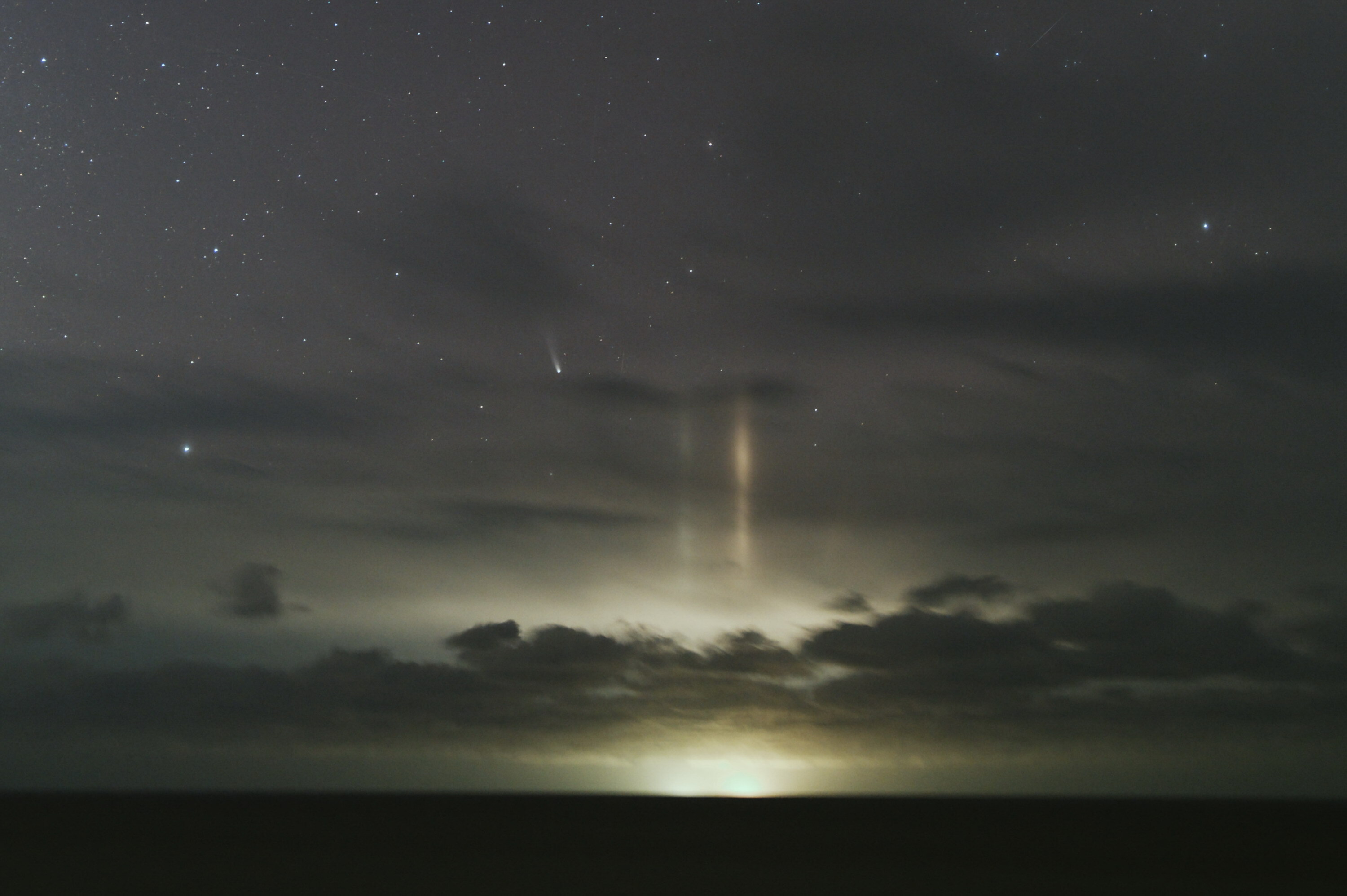 レモン彗星撮影中、水平線上に不思議な光条が現れました。後で確認するとどうやら漁火光柱のようです。初めてみました。 f50mm程度にトリミングしてます