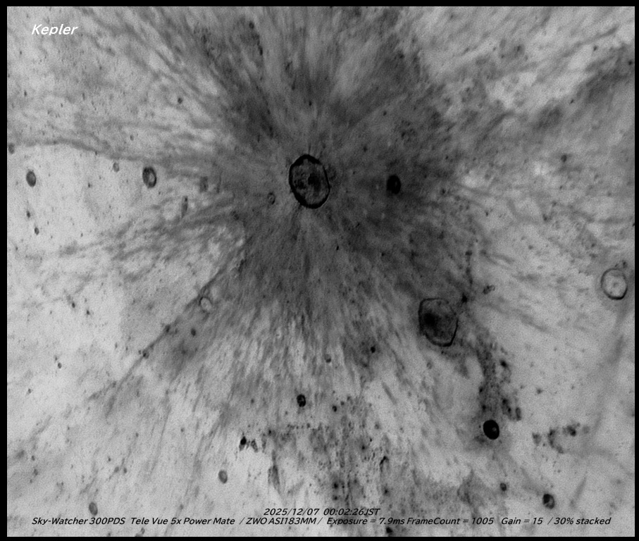 ケプラーから伸びる光条を白黒反転で強調。寒い中撮影しましたが期待したほどシーイングは良くありませんでした。