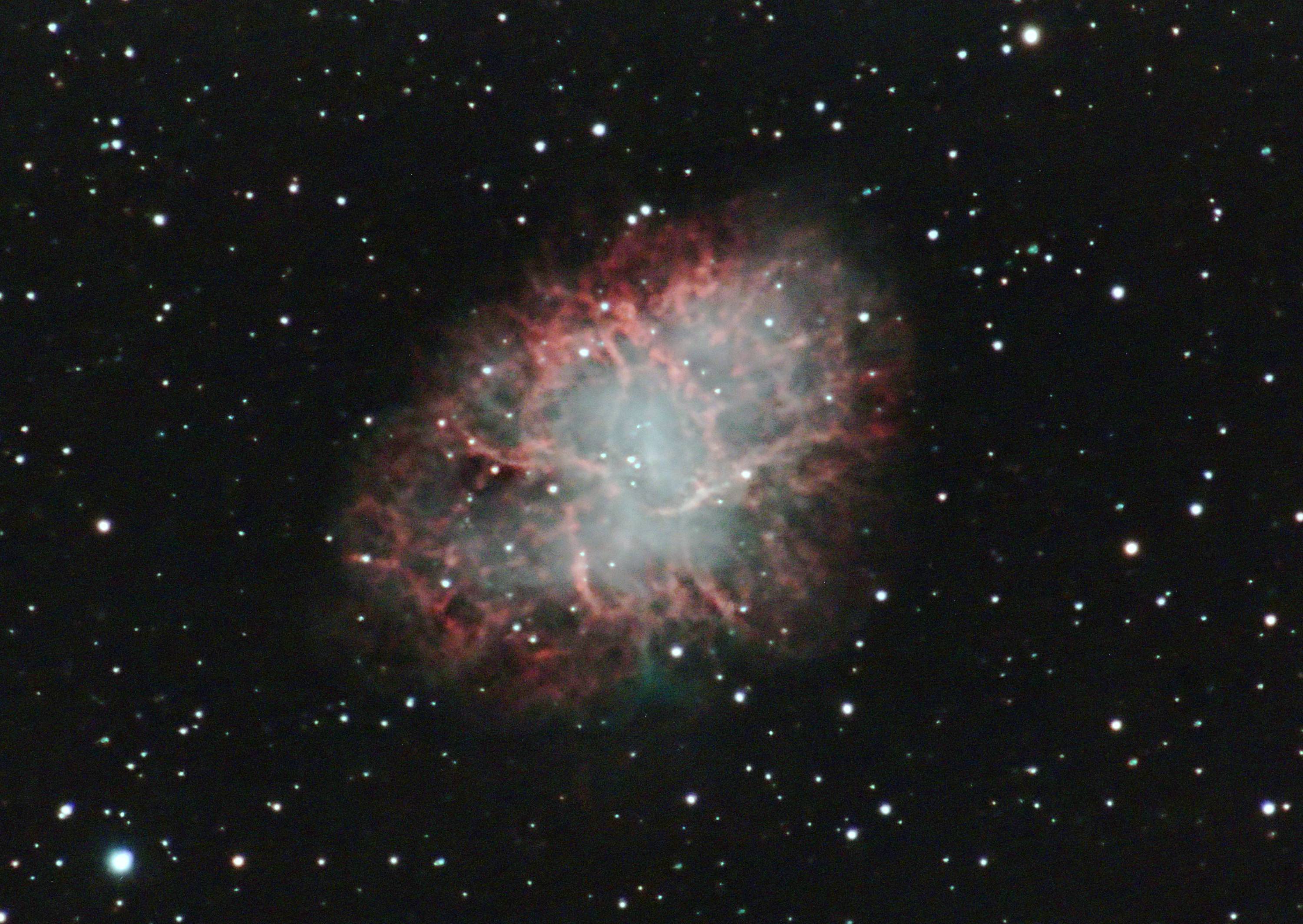 おうし座のかに星雲 M1を4000 mm 120分露出で撮りました。CBPでは全体がオレンジ色になり、蟹のフィラメントが明瞭に写ります。かにパルサーのジェット出口も中央で見えています。
