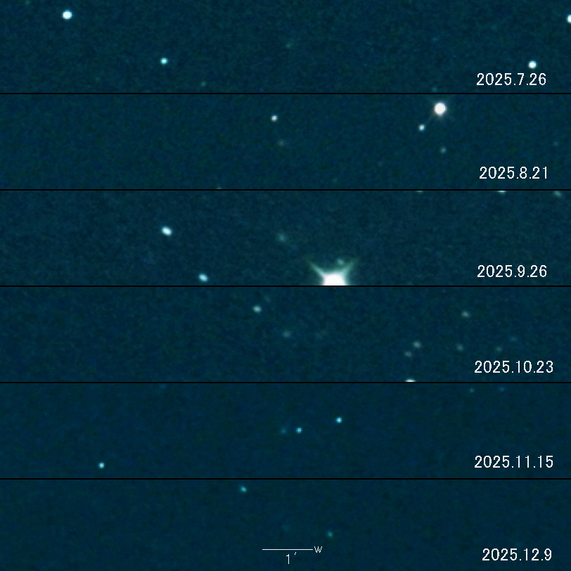 2025.7.26 → 16等級後半 2025.8.21 → 16等級前半 2025.9.26 → 15等級前半 2025.10.23 → 15等級後半 2025.11.15 → 16等級前半 2025.12.9 → 17等級前半 2025年3月9日が近日点でしたが 地球との位置関係により2025年9月頃が明るさのピークでした。 現在は減光中です。