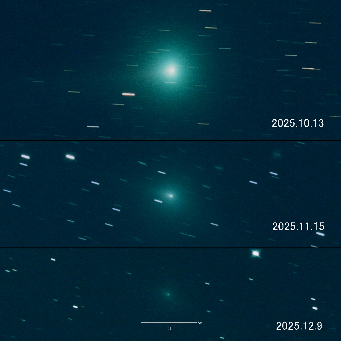 2025.10.13 → 6等級前半 2025.11.15 → 8等級前半 2025.12.9 → 11等級前半 2025年9月12日が近日点で 10月下旬が明るさのピークでした。 現在はかなり減光しました。