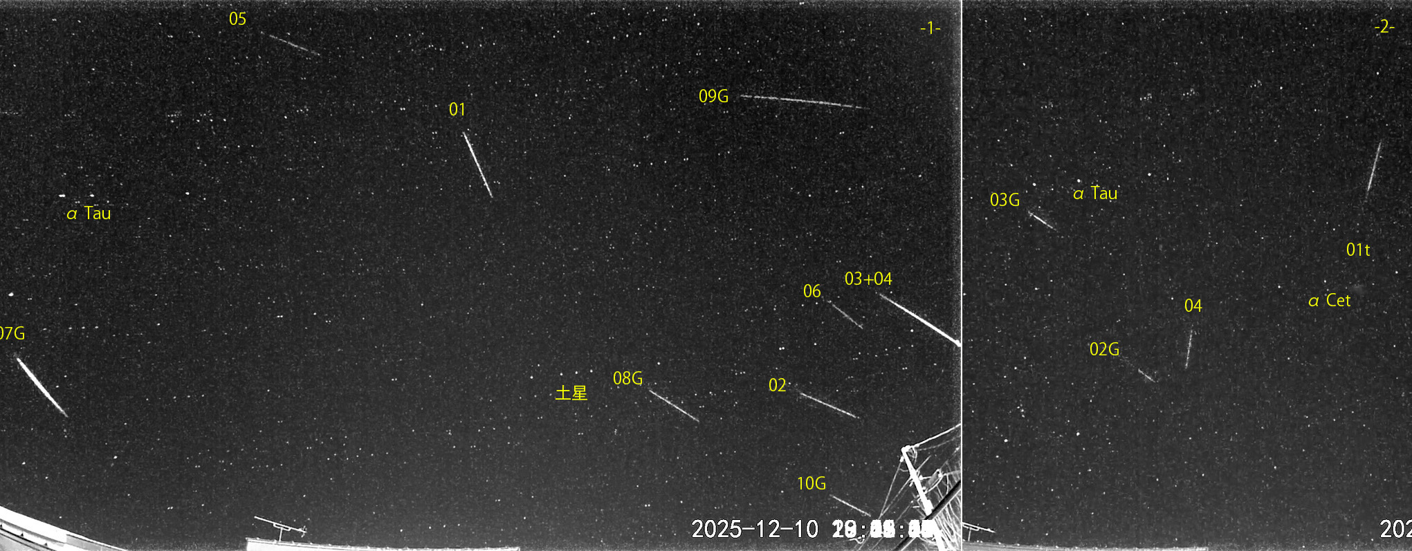 1) 18:02から約2.5時間の10コマを、2) 21:03から約1.5時間の4コマを処理しました。 出現した順に数字と記号を始点付近に記入。tは痕traceあり。 【流星群記号】G:ふたご座流星群、Mo:いっかくじゅう座流星群、Hy:うみへび座流星群