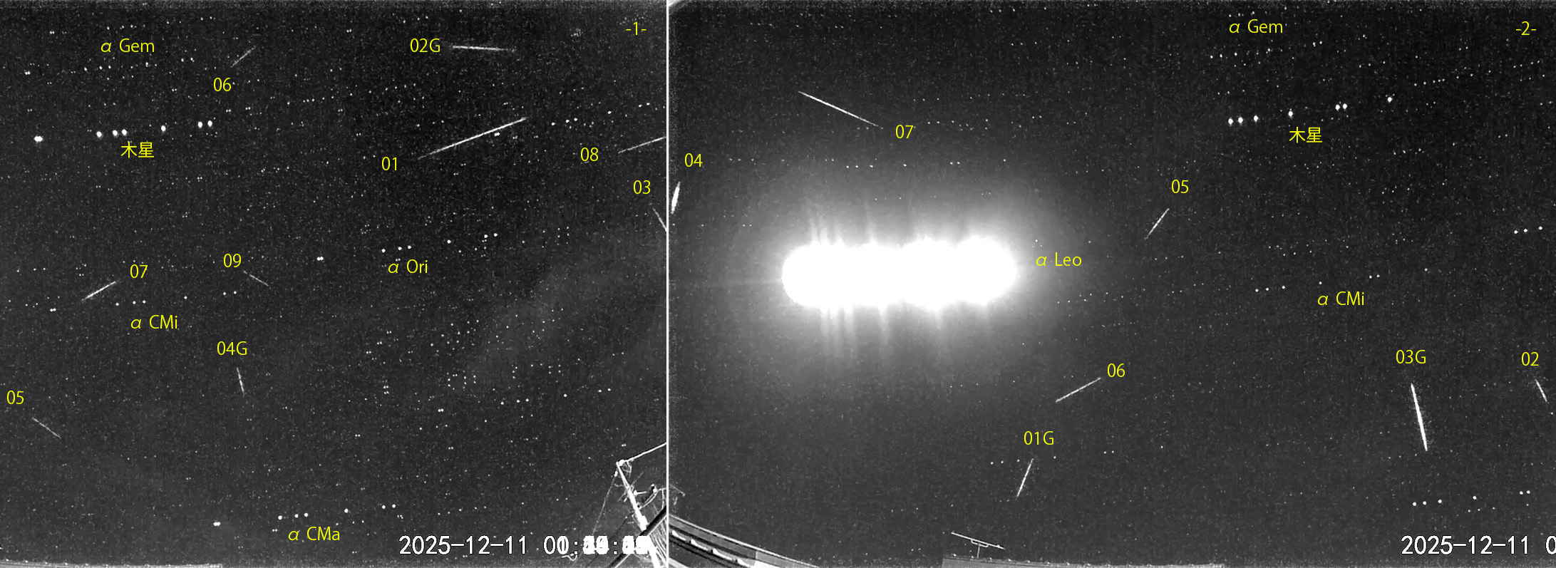 1) 00:48から約1時間の9コマを、2) 01:40から約2時間の7コマを処理しました。 出現した順に数字と記号を始点付近に記入。tは痕traceあり。 【流星群記号】G:ふたご座流星群、Mo:いっかくじゅう座流星群、Hy:うみへび座流星群