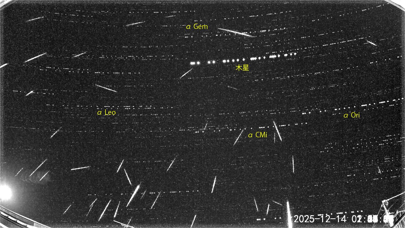 01:12から約2時間の40コマを処理しました。極大日の未明にあたり、天候はほぼ晴れていました。 出現した順に数字と記号を始点付近に記入。tは痕traceあり。 【流星群記号】G:ふたご座流星群、Mo:いっかくじゅう座流星群、Hy:うみへび座流星群、Co:かみのけ座流星群 ほとんどが「ふたご座群」流星のため、個別番号は省略。