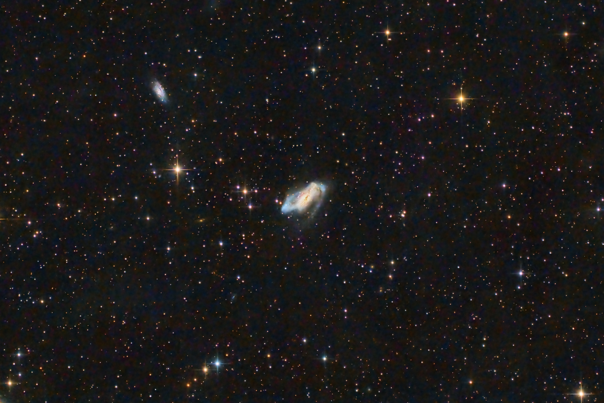 きりん座のゆがんだ棒状渦巻銀河です。左上のNGC2146Aの影響でこのような構造になったと考えられています。